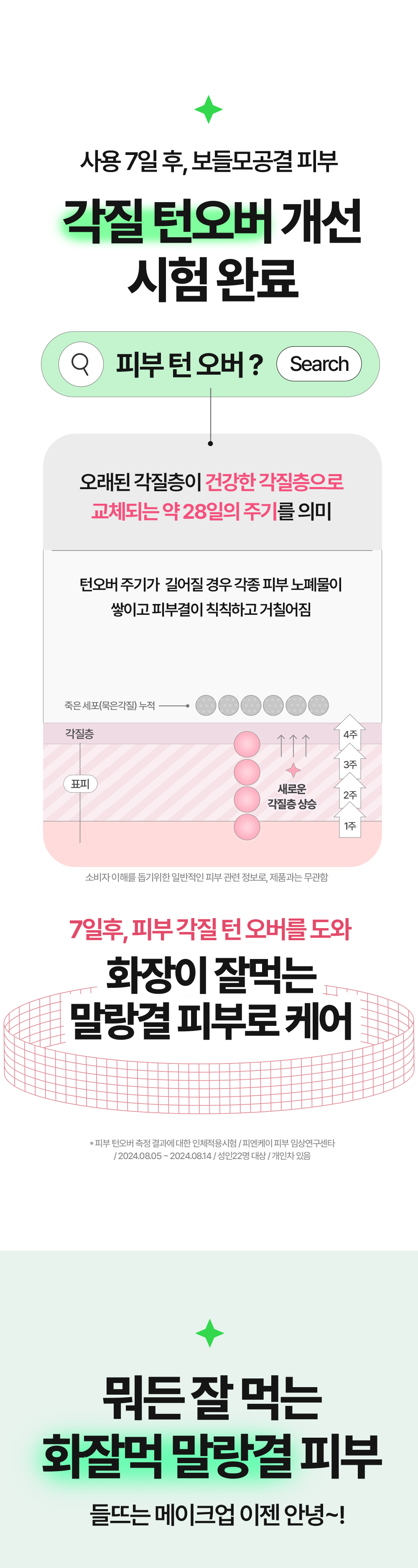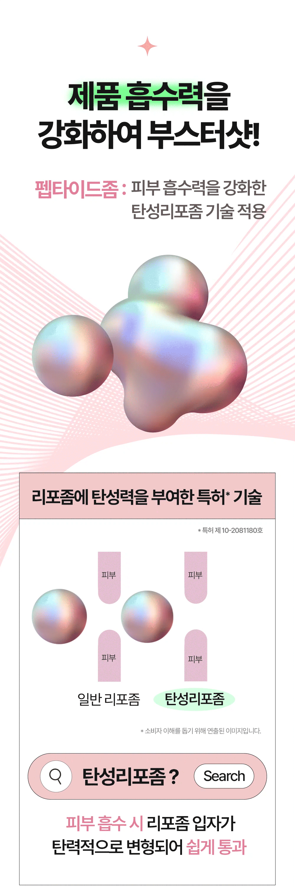 주요성분 정제수,다이프로필렌글라이콜,글루코노락톤,무화과수,트로메타민,글리세레스-26,나이아신아마이드,프로판다이올,1,2-헥산다이 올,글라이콜릭애씨드,다이에톡시에틸석시네이트,카카오씨추출물,무화과추출물,버지니아풍년화추출물,병풀추출물,하이드로제 네이티드레시틴,소듐하이알루로네이트,하이드록시아세토페논,메틸프로판다이올,부틸렌글라이콜,글리세린,소듐아크릴릭애씨 드/엠에이코폴리머,하이드록시에틸셀룰로오스,다이포타슘글리시리제이트,아데노신,다이소듐이디티에이,덱스트린,카프릴릴글 라이콜,소듐폴리아크릴레이트,석시닉애씨드,폴리락틱애씨드,노나펩타이드-1,아세틸헥사펩타이드-8,카퍼트라이펩타이드-1,트라 이펩타이드-1,팔미토일테트라펩타이드-7,팔미토일트라이펩타이드-1,팔미토일펜타펩타이드-4,헥사펩타이드-9,세라마이드엔피, 판테놀,수크로오스다이스테아레이트,에틸헥실글리세린,토코페롤