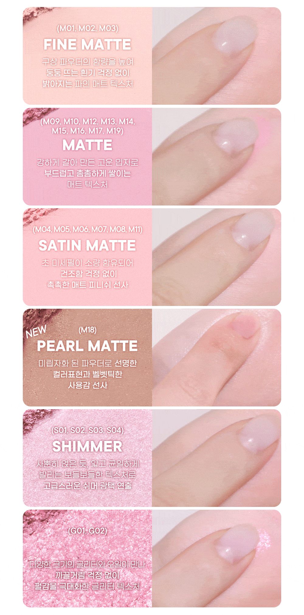 사용방법 싱글섀도우: 베이스 마무리 단계에서 내장된 퍼프로 얼굴 전체 또는 번들거리는 부위에 톡톡 두드려 가볍게 발라주세요.